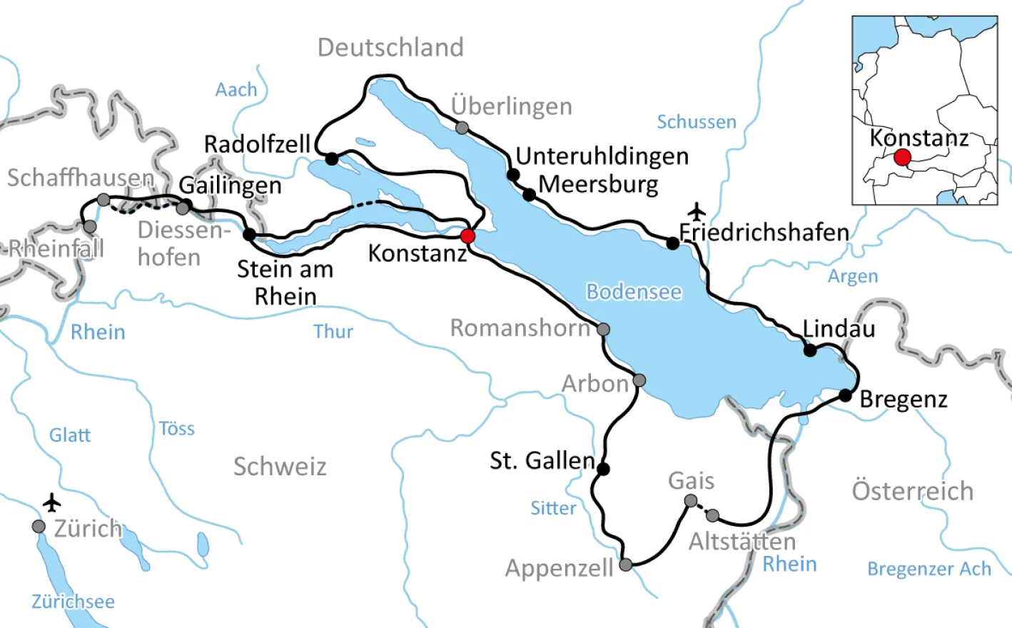 On our Great Lake Constance Cycling Holiday, you will experience one of Europe's most popular vacation regions in 12 eventful days. The Council City of Constance is your starting point and destination. Get to know the largest city on the lake, the flower island of Mainau and the island of Reichenau. A cycling vacation on Lake Constance provides you with an almost gradient-free cycling experience, ideal for inexperienced cyclists. Let yourself drift along around 350 kilometers. You will encounter varied landscapes and the maritime flair of large and small towns on Lake Constance – without any time pressure. Take a leisurely boat trip to the Rhine Falls rock, visit the Zeppelin Museum in Friedrichshafen and float up to the Pfänder. Don't worry about leaving your bike behind in between. It's worth it. The many sights around Lake Constance are even easier to explore on foot. The finest lake wines, crunchy apples and tasty whitefish round off your cycling vacation on Lake Constance with culinary delights.